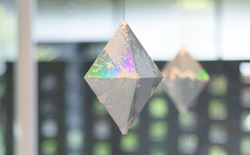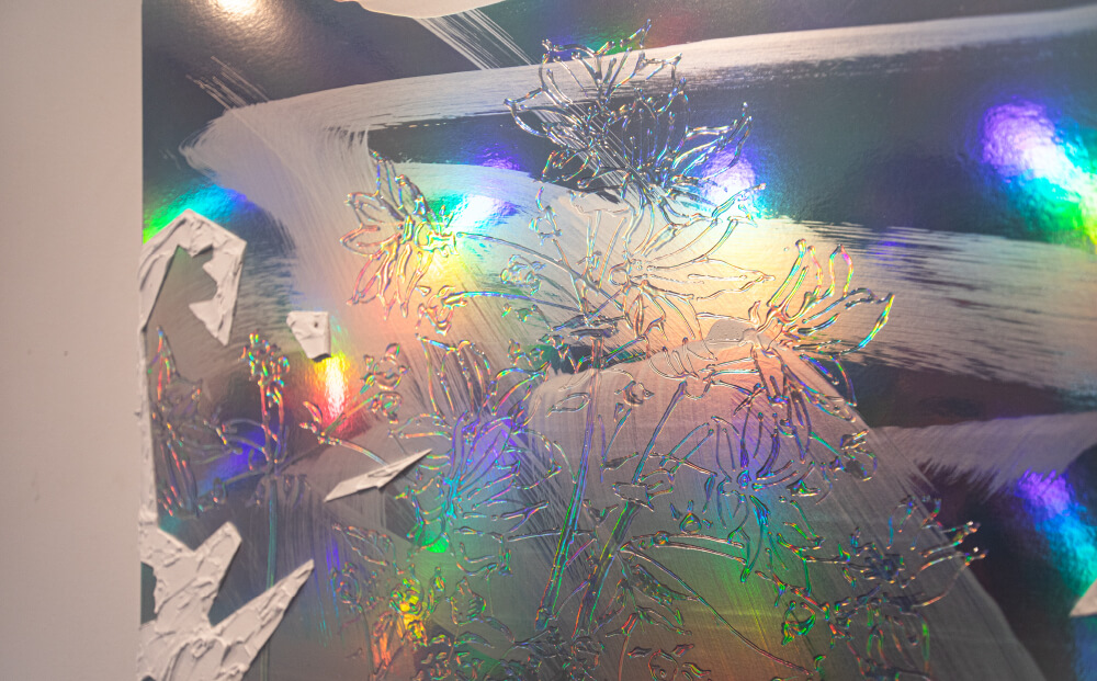 その作品は、ホログラム素材に透明な絵の具で”輝きを描く”手法が特徴。光の屈折を利用し、色を限定しない輝く絵を浮かび上がらせる。